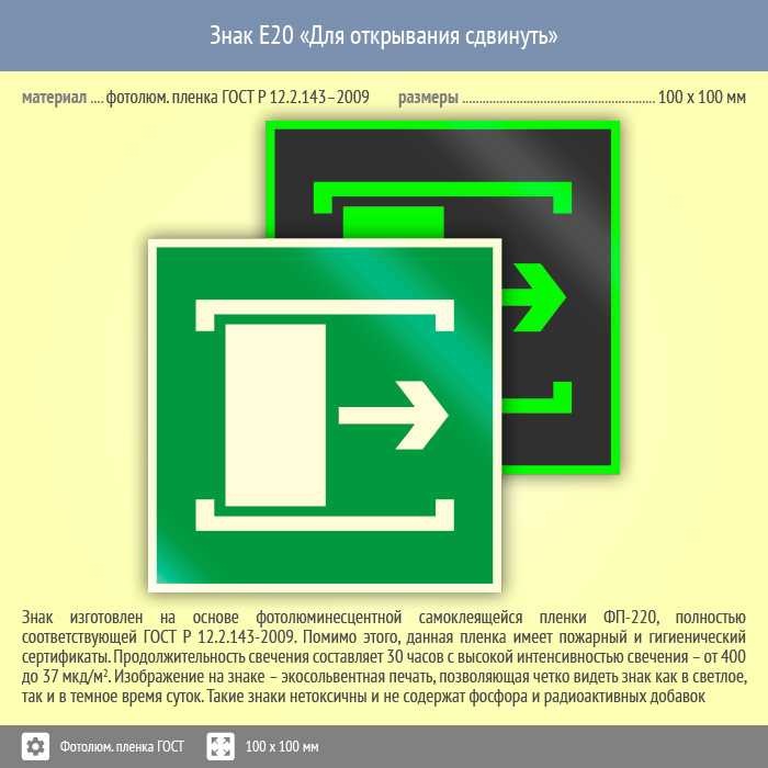 Знак E20 «Для открывания сдвинуть» (фотолюминесцентная пленка ГОСТ 34428-2018, 100х100 мм) в Апрелевке купить