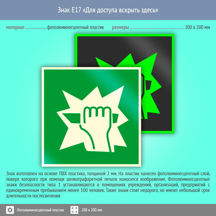 Знак E17 «Для доступа вскрыть здесь» (фотолюминесцентный пластик, 200х200 мм) в Апрелевке купить