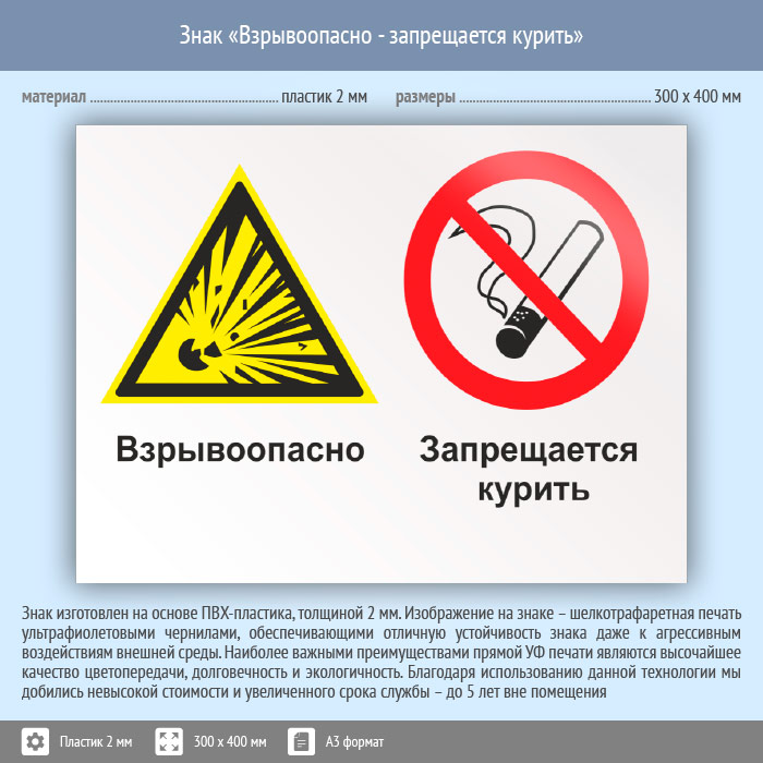 Знак «Взрывоопасно - запрещается курить», КЗ-06 (пластик, 400х300 мм) в Апрелевке купить