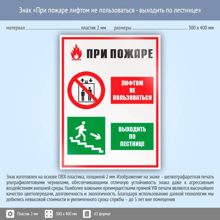 Знак «При пожаре лифтом не пользоваться - выходить по лестнице», КЗ-73 (пластик, 300х400 мм) в Апрелевке купить