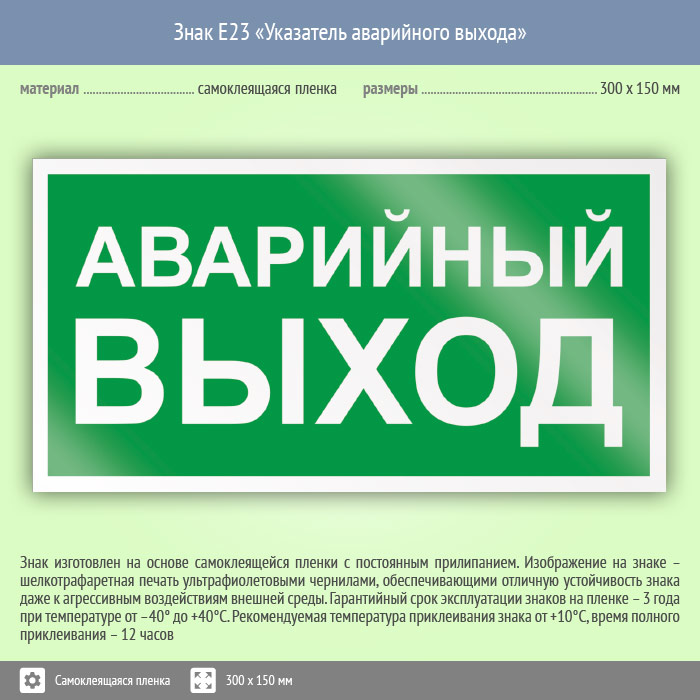 Знак E23 «Указатель аварийного выхода» (пленка, 300х150 мм)