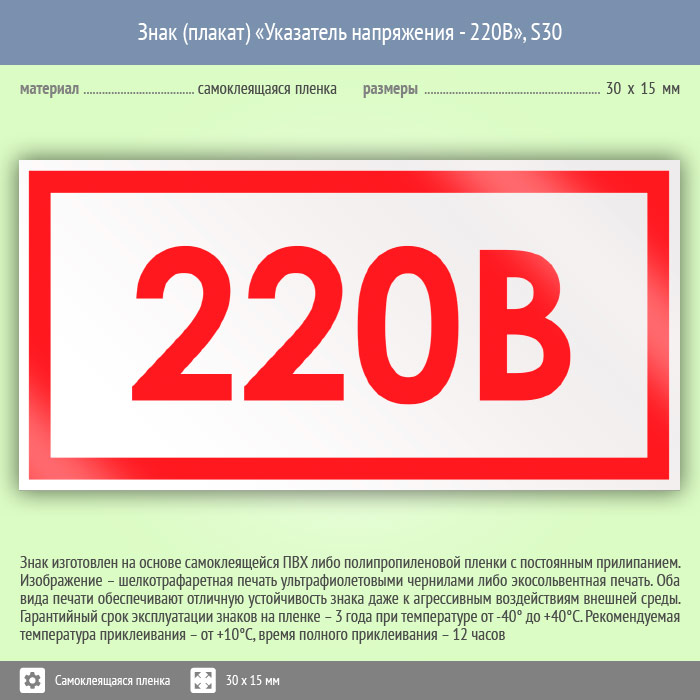 Знак (плакат) «Указатель напряжения - 220В», S30 (50 штук, пленка, 30х15 мм) в Апрелевке купить