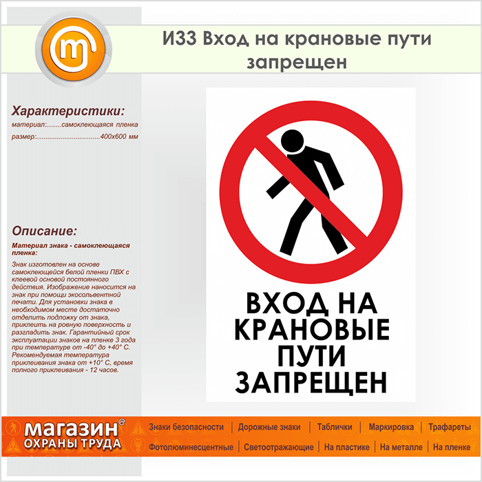 Знак «Вход на крановые пути запрещен», И33 (пленка, 400х600 мм) в Апрелевке купить