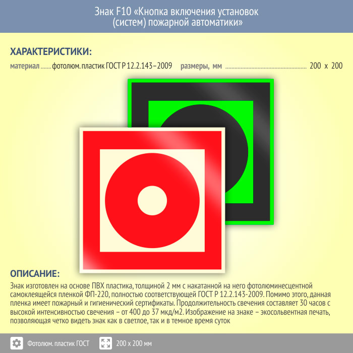 Знак F10 «Кнопка включения установок (систем) пожарной автоматики» (фотолюминесцентный пластик ГОСТ 34428-2018, 200х200 мм) в Апрелевке купить
